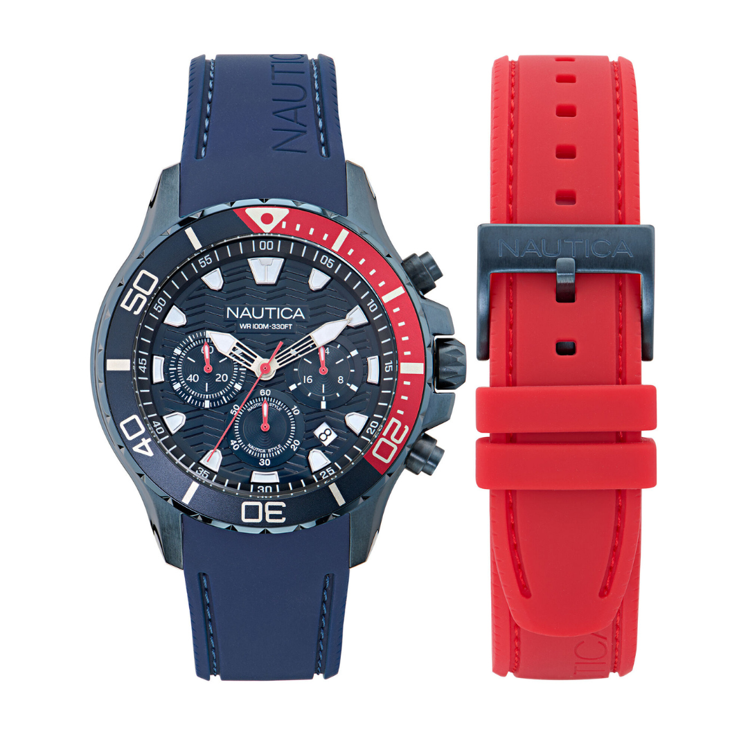 Elige tu estilo con este estuche de silicona NST. Este cronógrafo, con dos correas de silicona con el logotipo, cuenta con una caja de acero inoxidable reciclado de 44 mm y una esfera azul texturizada con un anillo superior sombreado y pulsadores a juego.