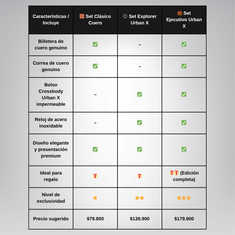 El Set Ejecutivo Urban X es mucho más que un conjunto de accesorios: es una declaración de estilo, orden y practicidad para el hombre que se mueve con confianza entre lo profesional y lo urbano. Diseñado para quienes valoran la funcionalidad sin renunciar a la estética, este set combina lo esencial en un solo paquete.